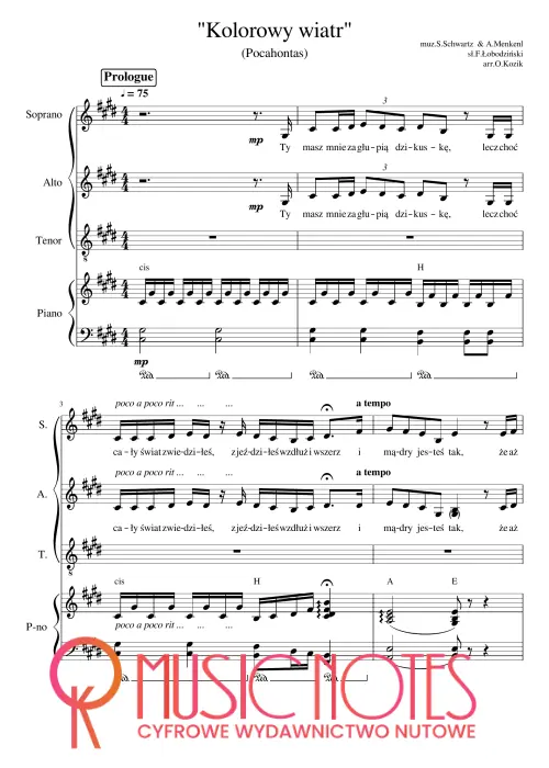 Aranżacja piosenki „Kolorowy wiatr” z filmu „Pocahontas” w wersji PDF. Nuty na orkiestrę – malowniczy nastrój i piękna melodia, świetne na koncerty tematyczne.