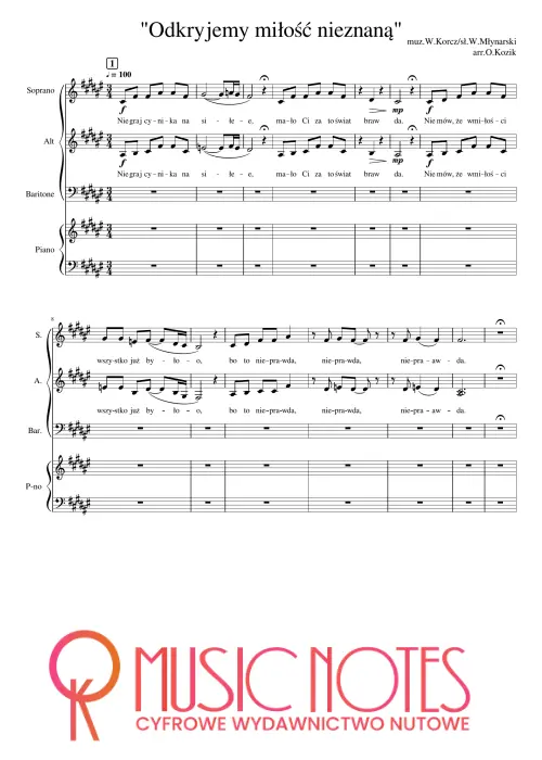 Aranżacja utworu Alicji Majewskiej „Odkryjemy miłość nieznaną” w wersji PDF. Nuty na orkiestrę – melodyjny nastrój i poruszające brzmienie, świetne na koncerty tematyczne i miłosne.