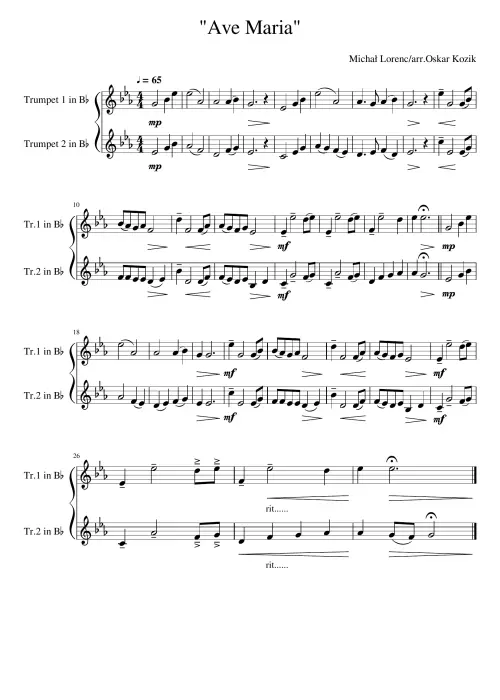 Aranżacja kompozycji Michała Lorenca „Ave Maria” na trąbkę w wersji PDF. Nuty na orkiestrę – sakralny klimat i podniosłe brzmienie, doskonałe na uroczystości i koncerty religijne.