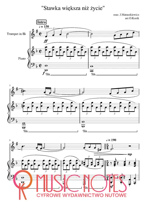 Aranżacja motywu z serialu „Stawka większa niż życie” na trąbkę i fortepian w wersji PDF. Nuty na orkiestrę – filmowy nastrój i historyczne brzmienie, świetne na koncerty z muzyką retro i tematyczne występy.