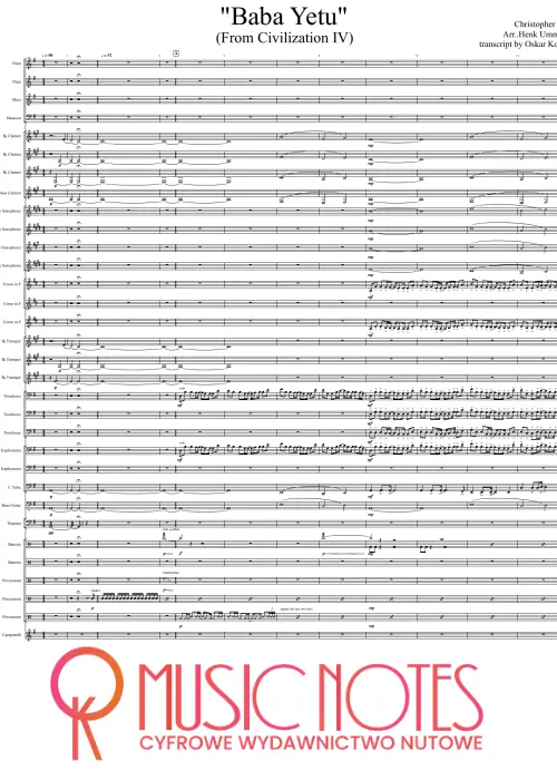 Aranżacja utworu „Baba Yetu” w wersji PDF. Nuty na chór i orkiestrę – afrykańskie rytmy i duchowy przekaz, idealne na koncerty tematyczne. Nuty Baba Yetu.