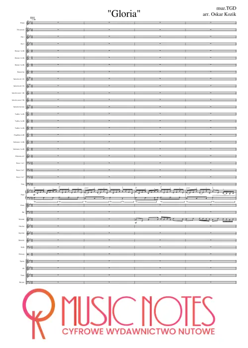 Aranżacja utworu „Gloria” w wersji PDF. Nuty na chór i orkiestrę – majestatyczne brzmienie, doskonałe na uroczystości kościelne i koncerty sakralne.