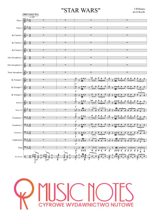 Aranżacja motywu z filmu „Gwiezdne wojny” w wersji PDF. Nuty na orkiestrę symfoniczną – epicki charakter, idealny na koncerty filmowe i galowe.