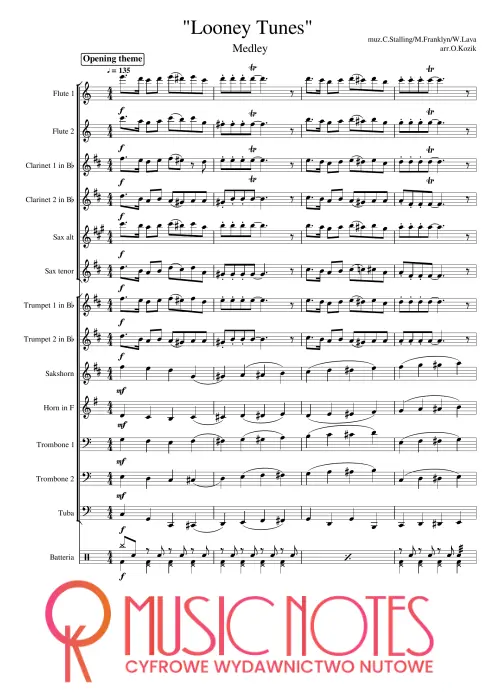 Aranżacja motywu z serii „Looney Tunes” w wersji PDF. Nuty na orkiestrę – humorystyczny klimat i żywe brzmienie, idealne na koncerty tematyczne i rodzinne.