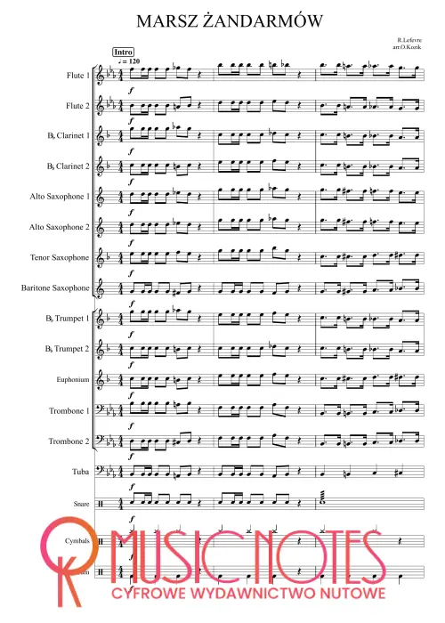 Aranżacja „Marsza żandarmów” w wersji PDF. Nuty na orkiestrę – zdyscyplinowany nastrój i rytmiczne brzmienie, idealne na koncerty tematyczne i defilady.