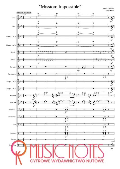 Aranżacja motywu z filmu „Mission Impossible” w wersji PDF. Nuty na orkiestrę – napięty klimat i dynamiczne brzmienie, idealne na koncerty filmowe i rozrywkowe.