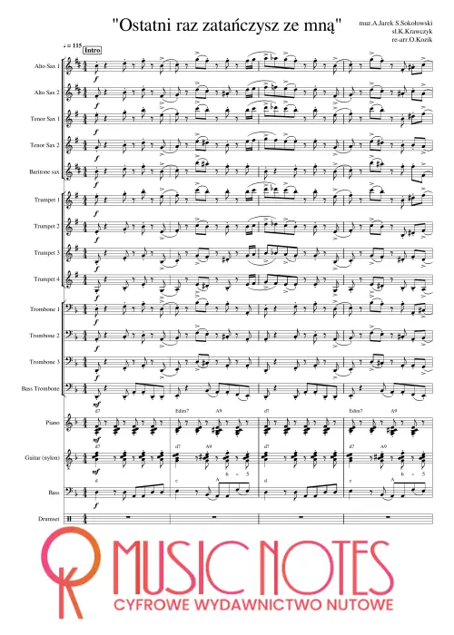 Aranżacja utworu Krzysztofa Krawczyka „Ostatni raz zatańczysz ze mną” w wersji PDF. Nuty na orkiestrę – romantyczny nastrój i taneczne brzmienie, świetne na koncerty walcowe i wieczory wspomnień.