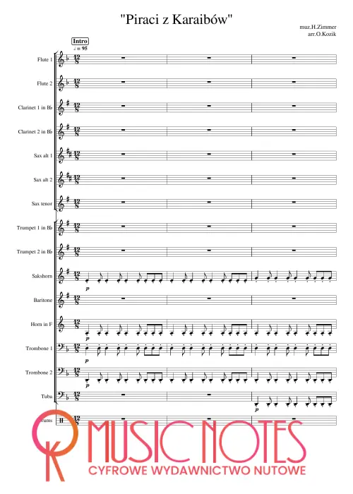 Aranżacja suity z filmu „Piraci z Karaibów” w wersji PDF. Nuty na orkiestrę – przygodowy klimat i filmowe brzmienie, świetne na koncerty tematyczne i spektakularne wydarzenia.