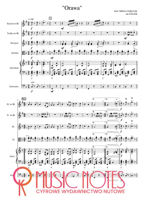 Aranżacja utworu „Orawa” w wersji PDF. Nuty na zespół ludowy – dynamiczny nastrój i góralskie brzmienie, doskonałe na koncerty symfoniczne i wydarzenia folklorystyczne.