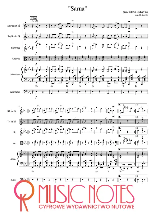 Aranżacja pieśni myśliwskiej A. Warchałowskiego „Sarna” w wersji PDF. Nuty na zespół ludowy – melodyjny nastrój i figlarne brzmienie, idealne na koncerty inspirowane naturą i wydarzenia kulturowe.